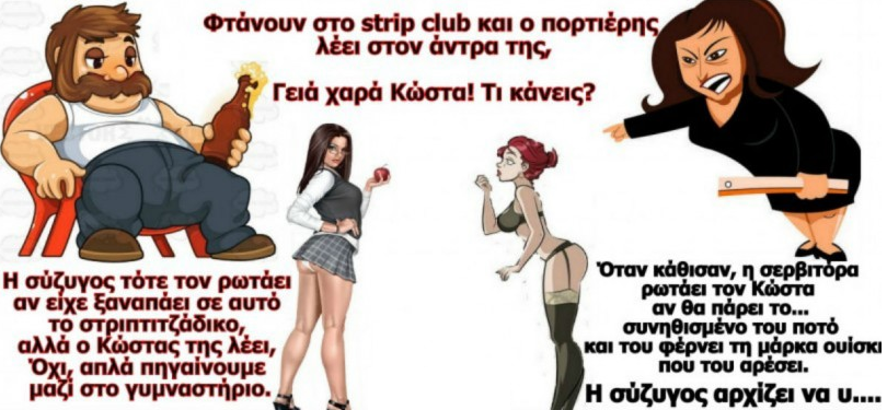 Η σύζυγος τότε τον ρωτάει αν είχε ξαναπάει σε αυτό το στριπτιτζάδικο, αλλά ο Κώστας της λέει, Όχι, απλά πηγαίνουμε μαζί στο γuμναστήριο.