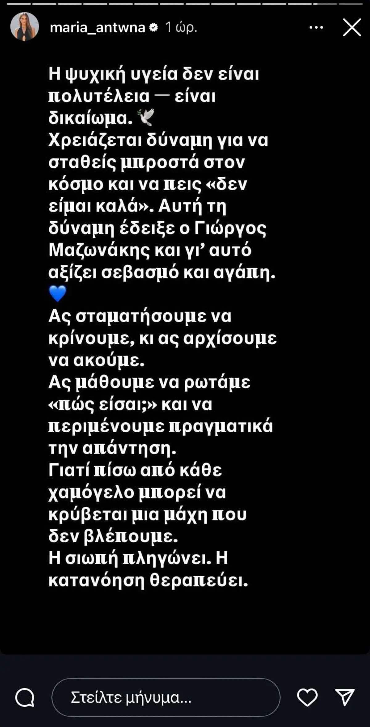 «Η ψυχική υγεία δεν είναι πολυτέλεια — είναι δικαίωμα. ️ Χρειάζεται δύναμη για να σταθείς μπροστά στον κόσμο και να πεις «δεν είμαι καλά». Αυτή τη δύναμη έδειξε ο Γιώργος Μαζωνάκης και γι’ αυτό αξίζει σεβασμό και αγάπη.