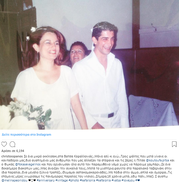 «Σε ένα μικρό εκκλησάκι,στα Βατσα Κεφαλλονιάς…Μόνο εσύ κι εγώ…Τρεις ψάλτες που μετά γίνανε οι κανταδόροι μας,δυο αγαπημένοι μας άνθρωποι που μας άλλαξαν τα στέφανα και τις βέρες η Πίτσα @koutoufa.pitsa και ο Φωκάς @fokasevagelinos και που οργάνωσαν όλο αυτό τον παραμυθένιο γάμο χωρίς να πάρουμε χαμπάρι…Σε ένα δεκαήμερο διακοπών μας…Μας άνοιξαν την αγκαλιά τους…Μετά το μυστήριο,φαγητο στο παραλιακό ταβερνάκι στην ίδια παραλία…Ενα μεγάλο ξύλινο τραπέζι…Θυμάμαι αστακομακαρονάδες…Με πόδια στην άμμο…απλά και όμορφα…Τις επόμενες μέρες γνωρίσαμε τις πανέμορφες παραλίες του νησιού…Σήμερα,16 χρόνια μετά…εδώ πάλι…Μαζί.